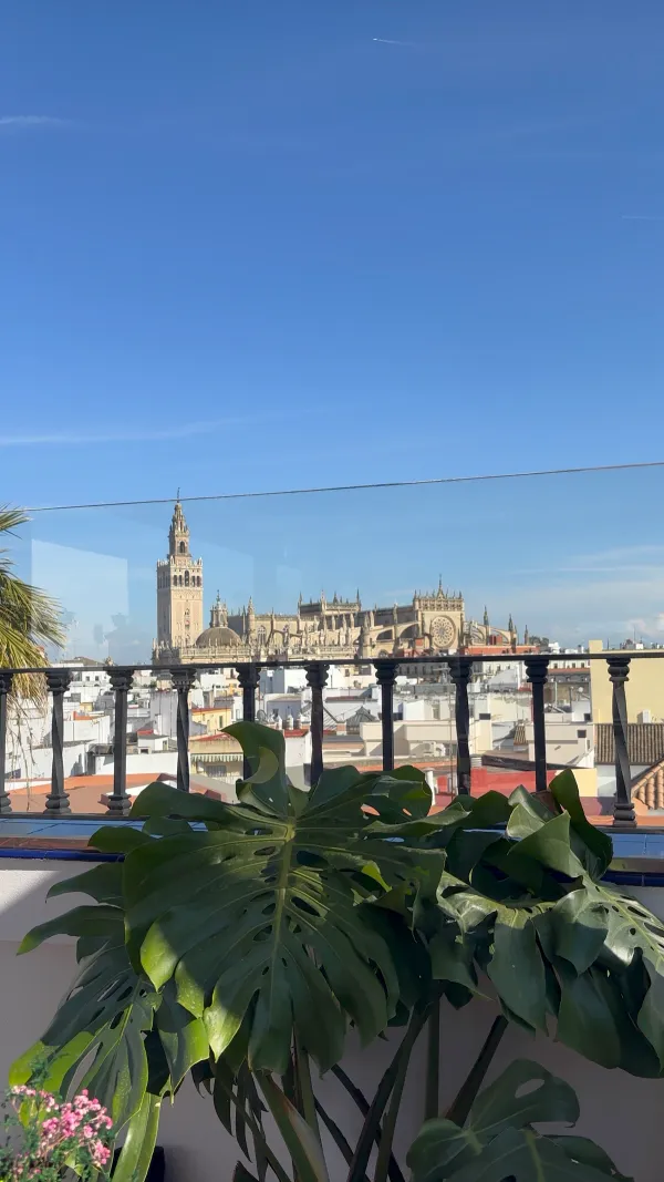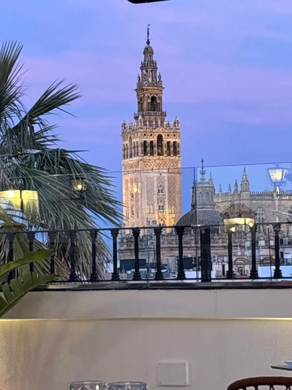 You step out of the elevator and suddenly there it is—the Cathedral of Sevilla, already glowing softly in the golden hour light. The surprise hits you first because the hotel isn't on a tourist drag, tucked quietly away from the main streets. But here, high above the city, you have this unobstructed view of one of Spain's most beautiful buildings. It's the kind of moment that makes you pause before even sitting down.